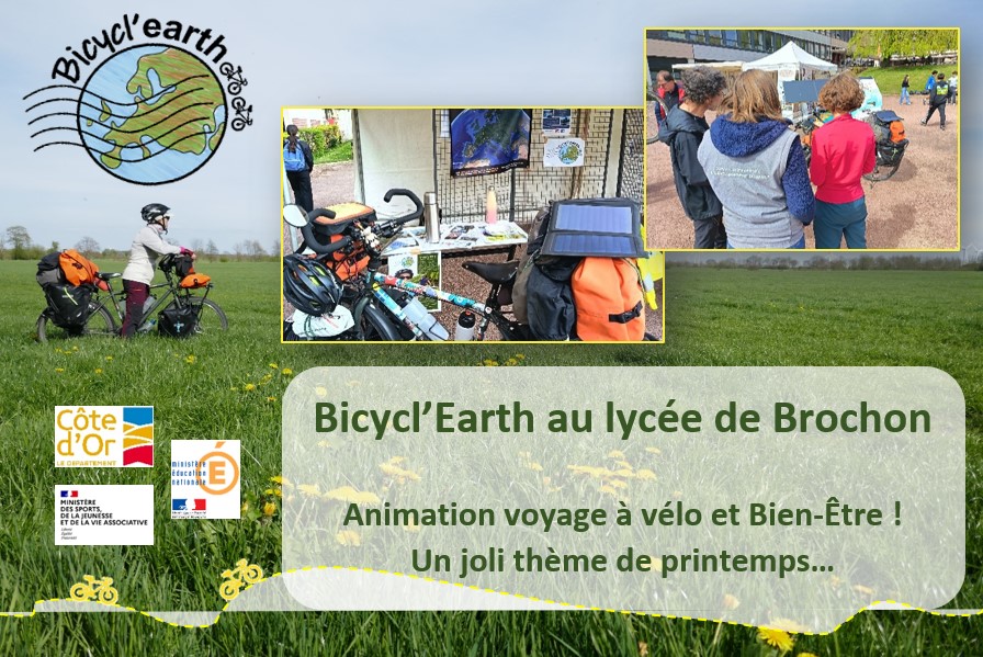 Bicycl’Earth était au lycée de Brochon début avril : le thème pour ce printemps ? Lebien-être… Quelle jolie façon d’envisager le voyage à vélo ! Nous étionsravis de participer à ces animations. Les bénévoles sont donc venus à la rencontre des lycéennes etlycéens pour discuter de ce mode de transport lent et bon pour le corps etl’esprit. Une façon de voyager qui prend soin de nous autant que de notreplanète !